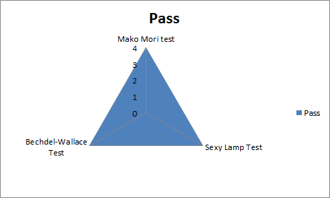 Locuas states that the barest minimum for clearing the Crystal Gems test is at least two characters who pass Bechdel-Wallace, one of whom passes both Mako Mori and Sexy Lamp (similar to a "C grade").