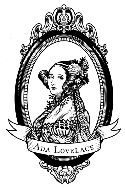 Ada Lovelace, a woodcut graphic by Colin Adams based on the original watercolor by Alfred Edward Chalon. Created for the Ada Initiative.